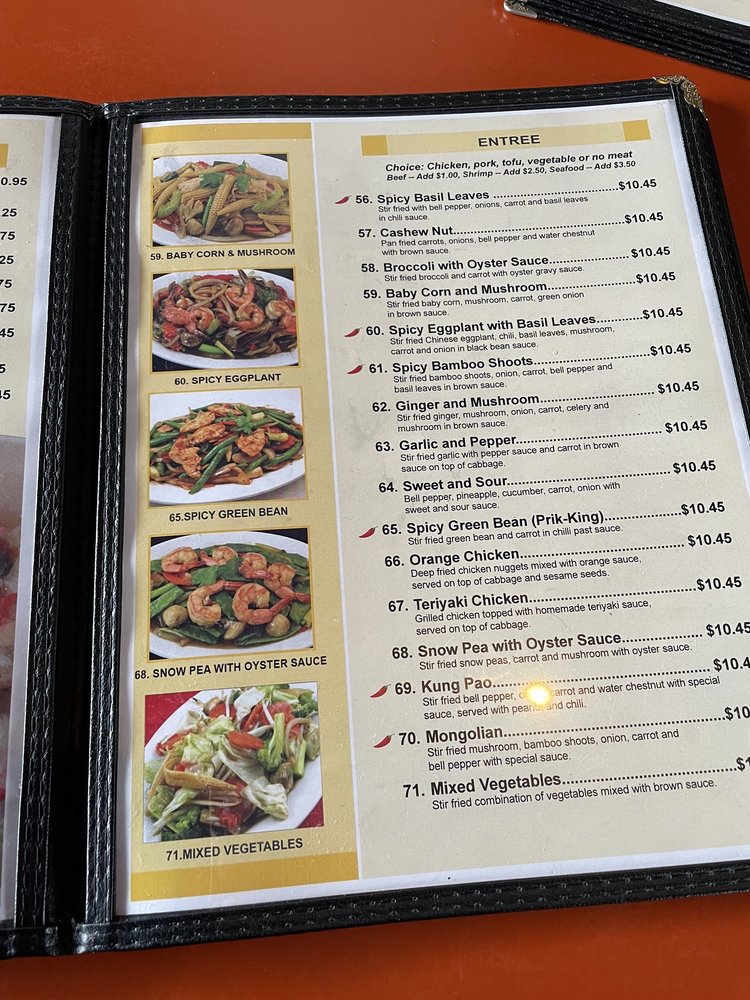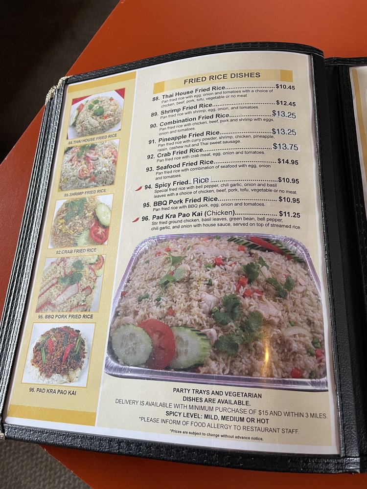 Special fried rice with bell pepper, chili garlic, onion and basil leaves with a choice of chicken, beef, pork, tofu or vegetable. Spicy.